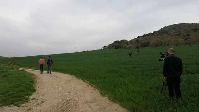 F. L., a la izquierda caminando con otra persona, durante la grabación de un programa de televisión. / Foto cedida a LOZ